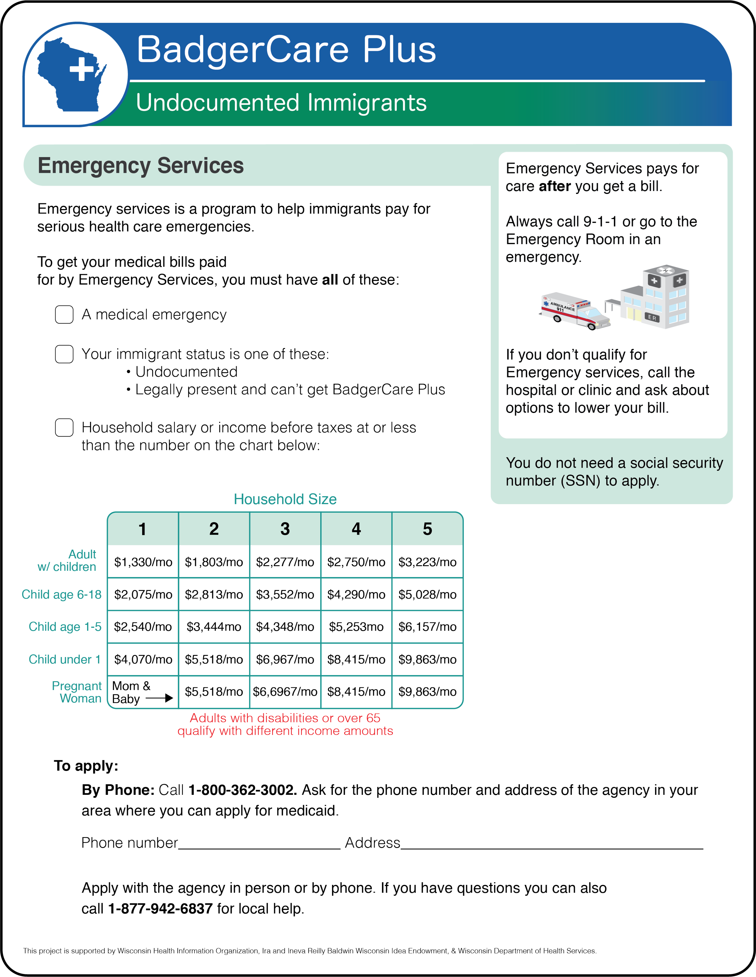 This program helps immigrants who don’t have other insurance or who are undocumented pay for health care emergencies for children, caregivers, adults with disabilities, and adults over age 65.